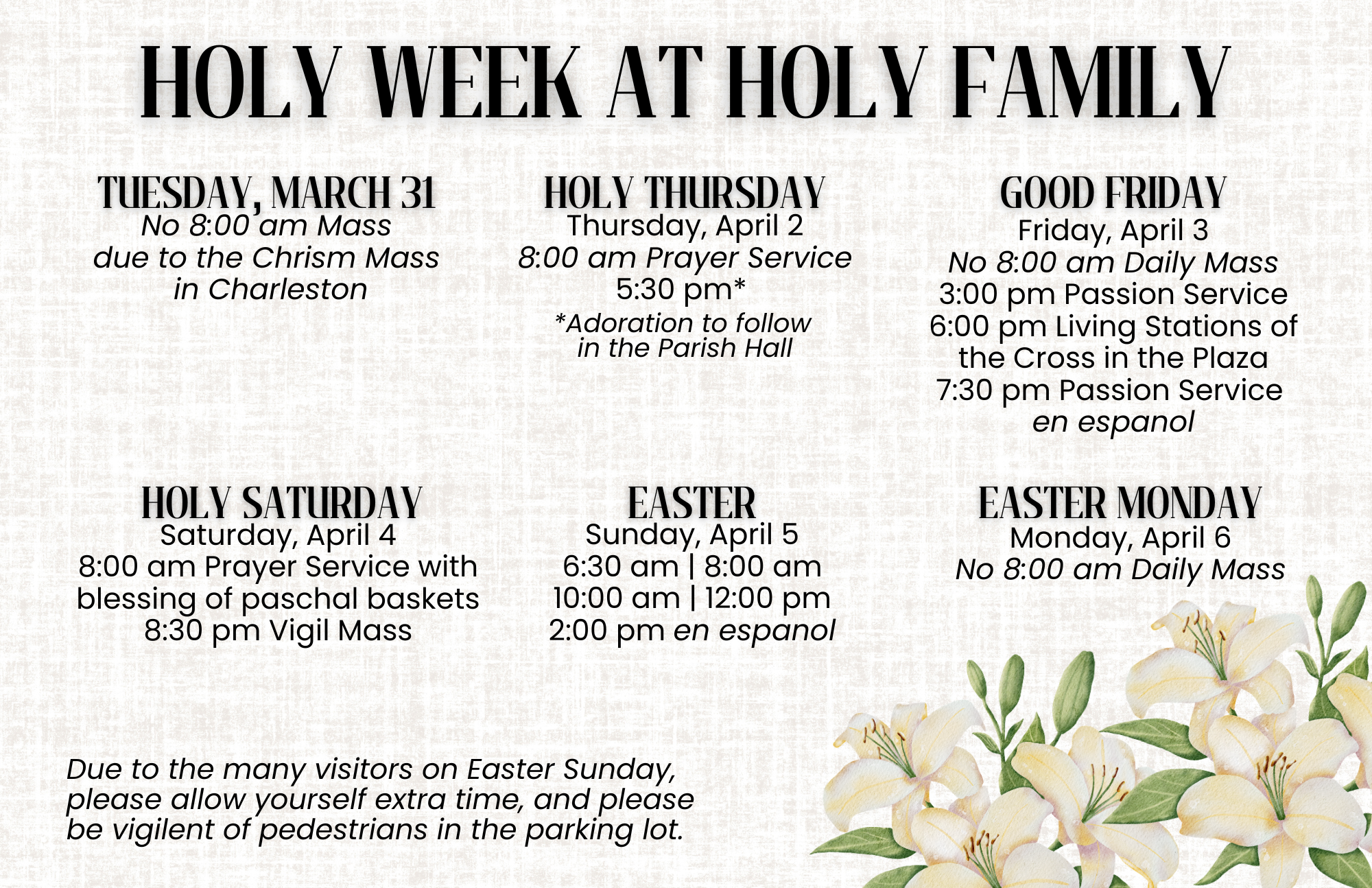 after the 8:00 am Mass - Saturday: 3:30-4:30 pm